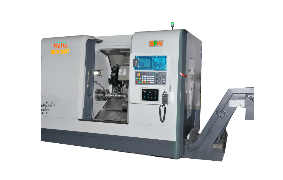 Helix Series machines feature a single-piece inclined bed with heavy-duty LM guideways for rigidity and precise ball screws for accuracy. A standard BMT 65 servo turret, parallel spindle-turret-tailstock axes, and newest turning-mill technology enable higher depth of cut.